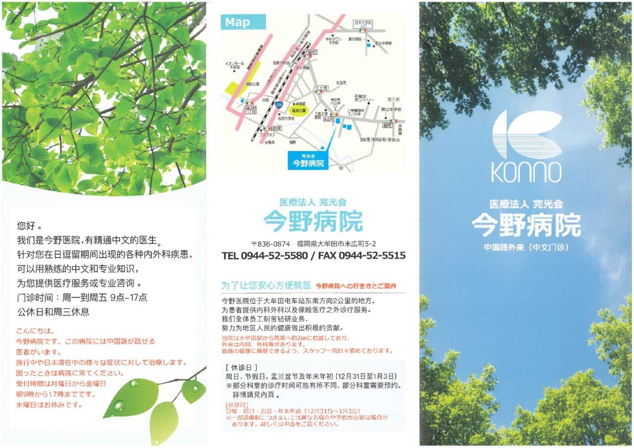 中国語外来(中文门诊)パンフレットのご案内 公開日時:2025.12.16カテゴリー:お知らせ 今野病院近隣の福岡・熊本県にお住まいの方、お気軽にお越しください。 欢迎今野医院附近的福冈、熊本居民随时前来!